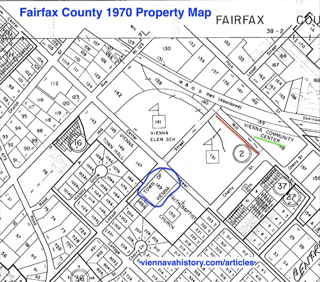 In 1970, an unbuilt portion of Mill Street SE (red) remained designated adjacent to the Community Center (green). The Town needed to have the right-of-way vacated so it could build the pool at the Community Center. The Bowman lot was nearby (blue) and considered as an alternative site. (Base map is from the Fairfax County Digital Map Viewer, tax map grid square 38-4).