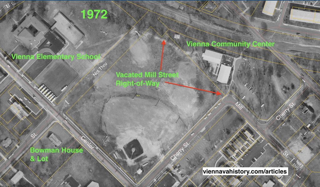 This aerial photo from 1972 shows the vacated stretch of Mill Street SE next to the Community Center and the Bowman lot to orient you to the two locations considered in 1970 for the Vienna pool. The base image is from the Fairfax County Historical Imagery Viewer. The faint yellow lines show today’s parcel boundaries.