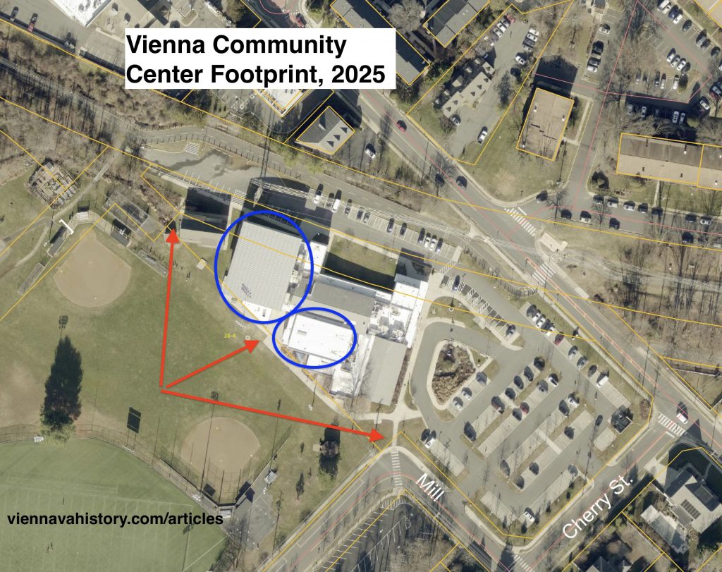 This aerial image shows that in 2025, the footprint for the Vienna Community Center had grown to be a good deal larger than in the 1972 photo above. The photo also shows that portions of the post-1972 additions (blue circles) to the facility were placed on the former Mill Street strip (red arrows), underscoring why Town officials wanted to vacate the Mill Street right-of-way when they were planning to build a pool next to the Community Center. (Base image from the Fairfax County Historical Imagery Viewer).
